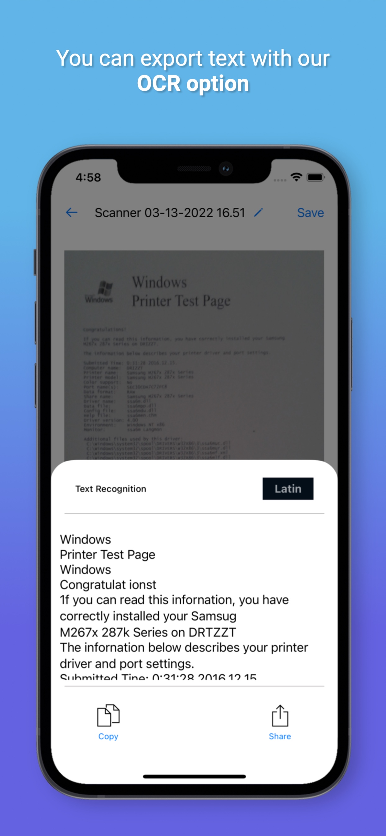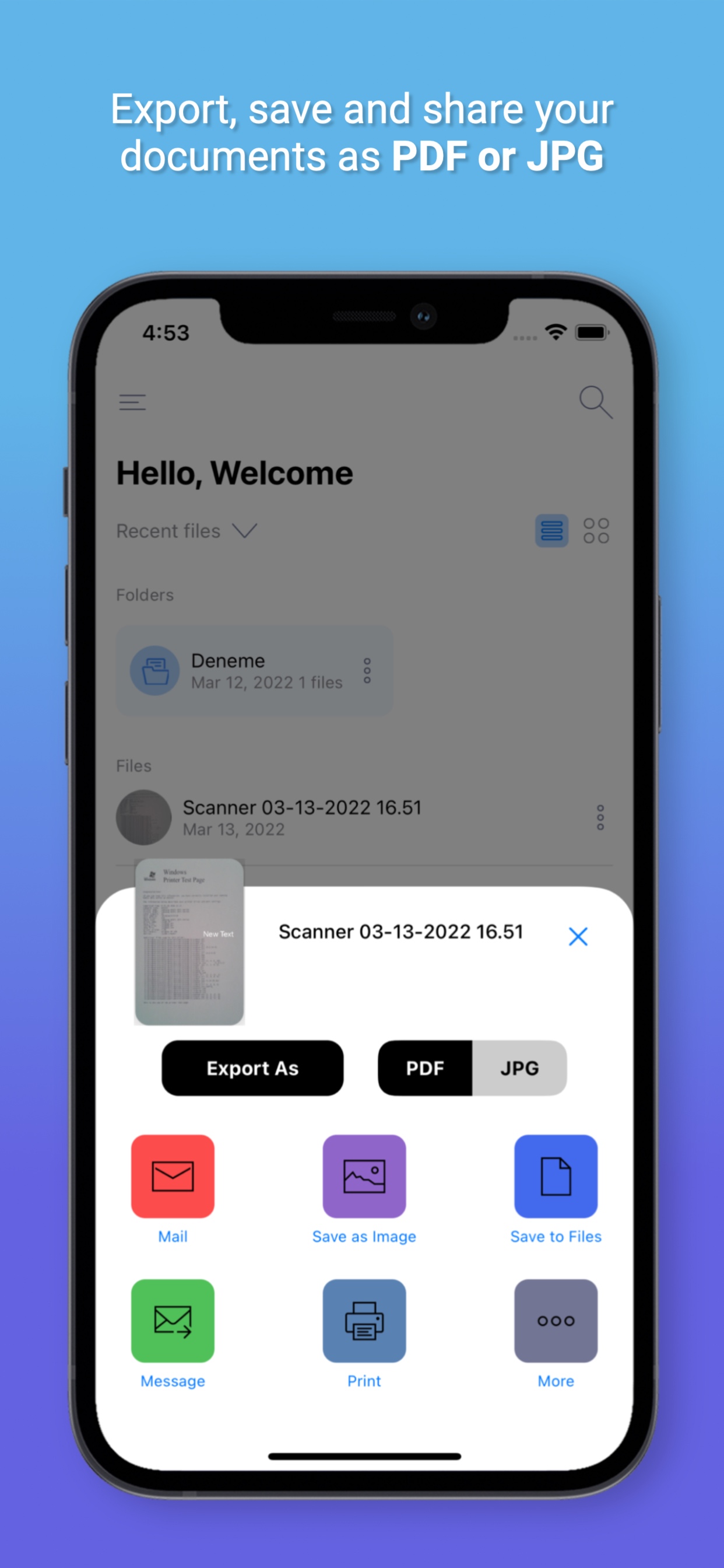 Simply hold your smartphone or tablet over a document and it will automatically scan document. The scanner app will then crop the document and optimize the colors. Save your scan as PDF or JPG with one tap.